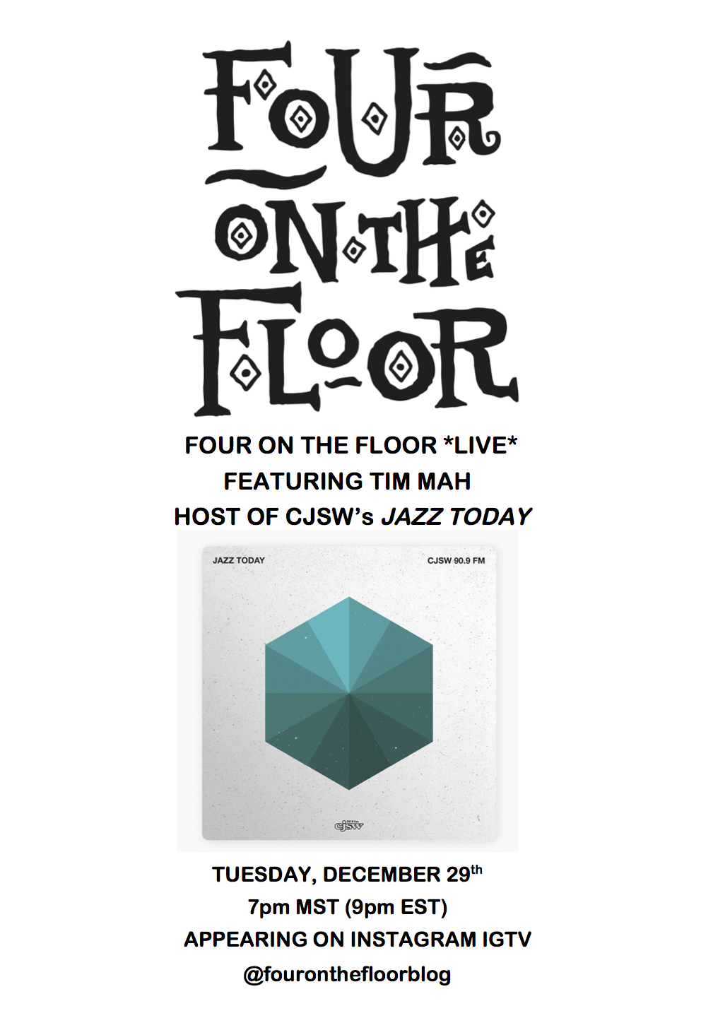 Please join us for our next episode happening this Tuesday, December 29th at 7pm MST (9pm EST), appearing on Instagram Live @fouronthfloorblog featuring Tim Mah, host of CJSW's radio program Jazz Today.